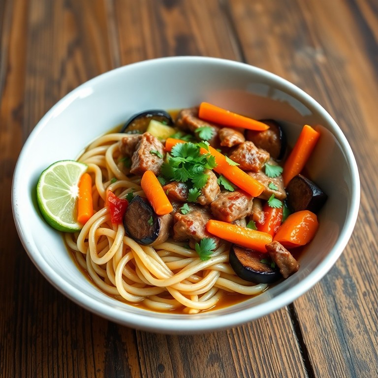 Uma explosão de sabores asiáticos com macarrão udon, carne picadinha marinada em gengibre e especiarias, e legumes salteados. Preparo rápido e perfeito para uma refeição nutritiva.