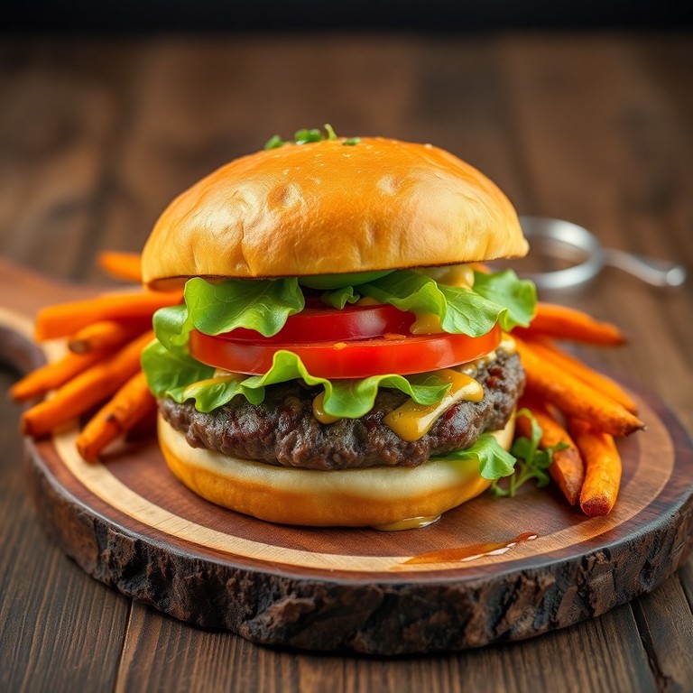 Una hamburguesa clásica gourmet con mayonesa de ajo asado, lechuga crujiente y tomate jugoso, servida en pan brioche tostado. Perfecta para una comida rápida y deliciosa.