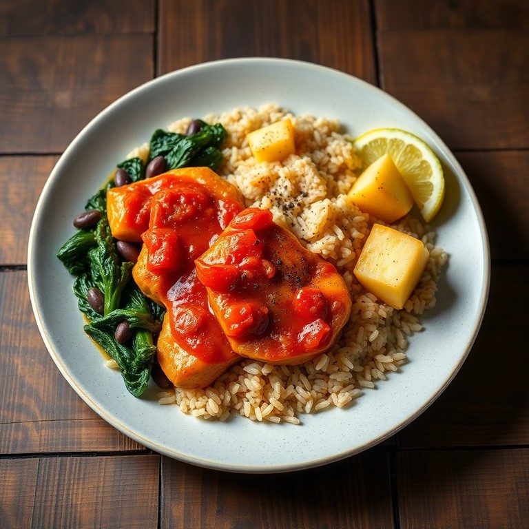 Um prato reconfortante e nutritivo, ideal para o dia a dia, combinando o sabor do frango com a riqueza do arroz integral e do feijão, complementado com a frescura da couve.