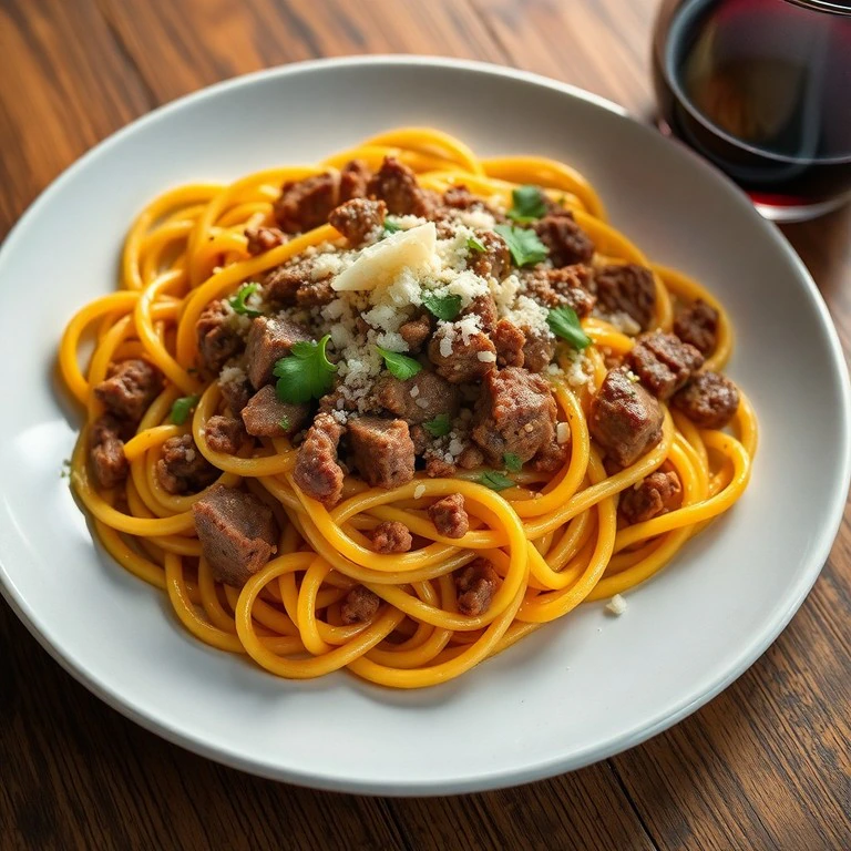 Uma reviravolta saborosa no clássico carbonara, com carne moída refogada em chimichurri para um toque argentino.