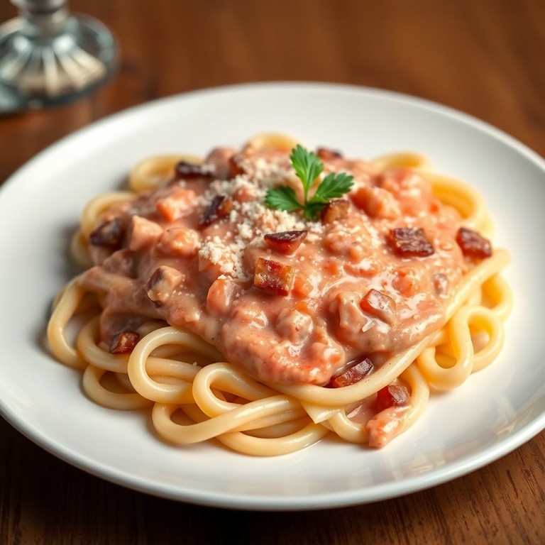 Macarrão Cremoso com Molho Rosé de Bacon e Queijo