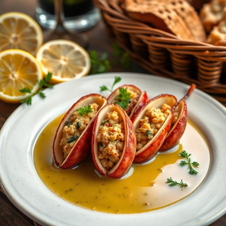 Zarte Baby-Calamari, gefüllt mit einer raffinierten Gamba-Farce, verfeinert mit Zitrone und Kräutern. Ein mediterraner Genuss, der in Weißwein geschmort wird.