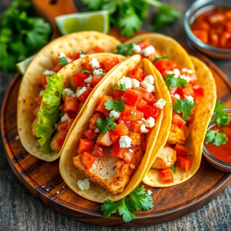 Deliciosos tacos con pollo marinado, salsa de tomate casera y verduras crujientes, perfectos para una comida rápida y llena de sabor.