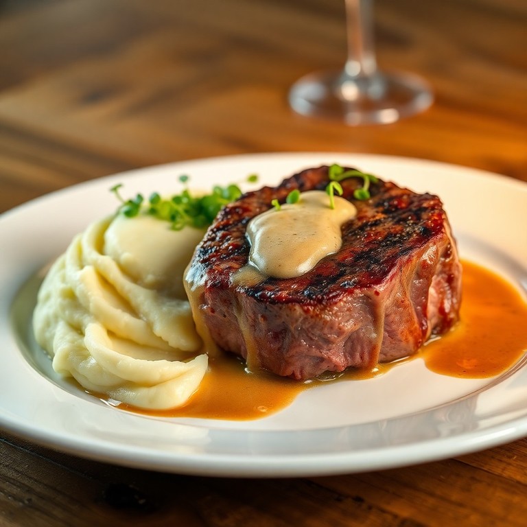 Clássico prato de filé mignon ao ponto, acompanhado de purê de batatas cremoso e molho poivre aromático, finalizado com brotos frescos para um toque sofisticado e fresco. Ideal para jantares especiais e ocasiões que pedem um sabor marcante e apresentação elegante.