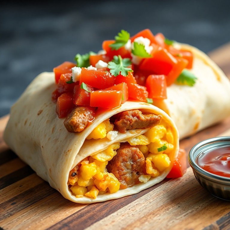 Un burrito al estilo mexicano que combina salchicha salteada, huevos revueltos cremosos y una salsa de tomate fresca y casera. Ideal para un desayuno nutritivo y fácil de llevar, perfecto para disfrutar en movimiento.