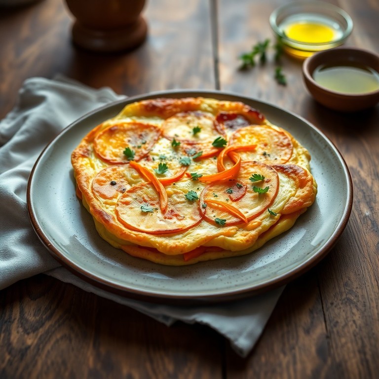 Una versión colorida y deliciosa de la clásica tortilla española que incorpora zanahorias ralladas junto con papas para aportar un toque dulce y una textura extra. Perfecta para un almuerzo o cena ligera, esta tortilla se cocina lentamente para lograr una textura suave y jugosa.