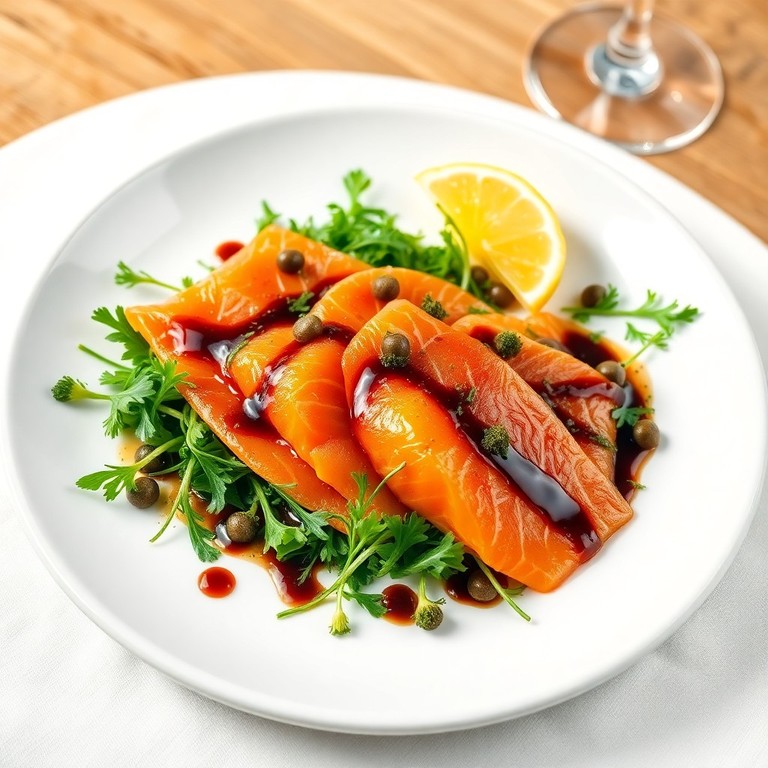 Láminas finas de salmón ahumado servidas con una vinagreta balsámica suave y aroma a eneldo, ideales como entrada elegante y rápida.