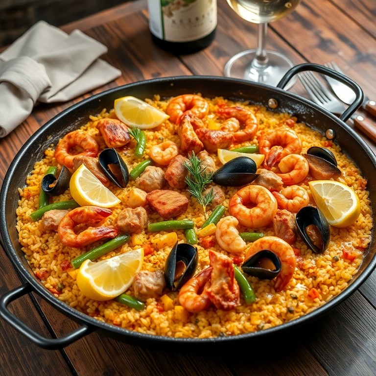 Una deliciosa versión clásica de la paella que combina arroz blanco de grano medio con pollo, conejo, mariscos frescos y verduras tradicionales como judías verdes y alcachofas. Perfecta para una comida festiva y auténtica que captura la esencia de la cocina valenciana.