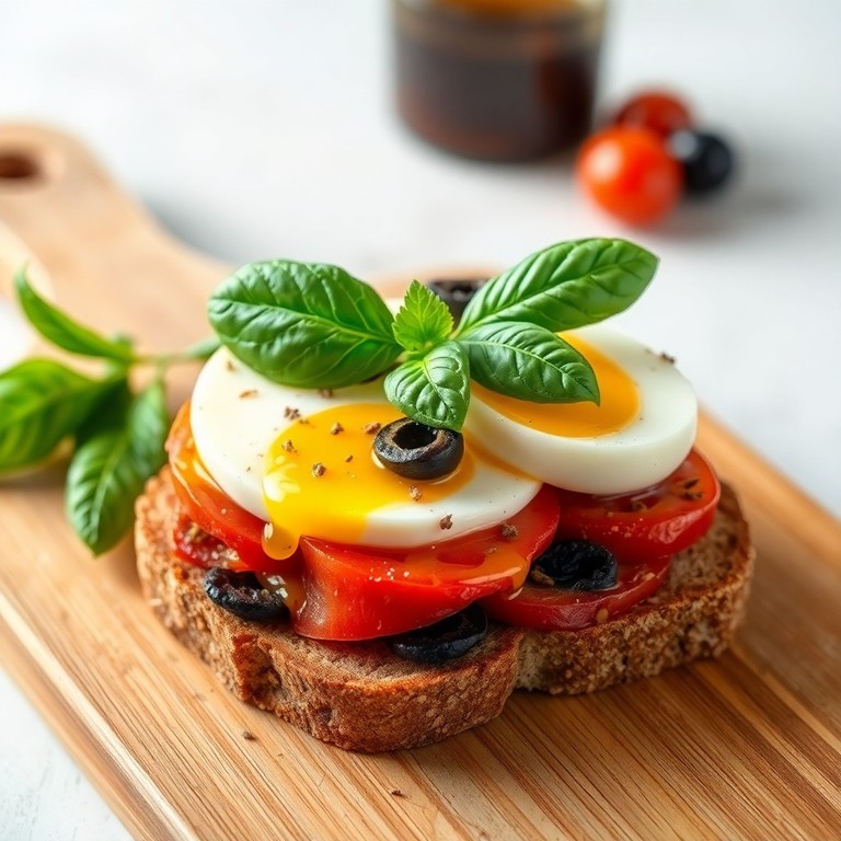 Sanduíche robusto e aromático inspirado na culinária mediterrânea, com ovos cozidos fatiados, tomates secos, azeitonas e azeite de oliva sobre pão torrado crocante.
