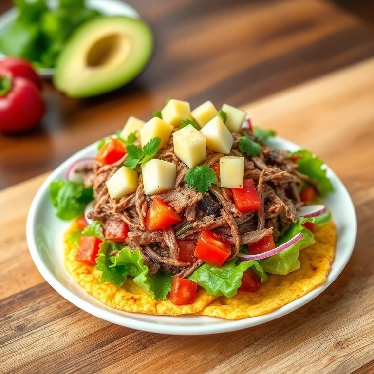 Una ensalada mexicana fresca y ligera de res deshebrada, mezclada con vegetales crujientes, jugo de limón y aguacate, servida sobre tostadas horneadas. Ideal para una comida saludable y rápida.