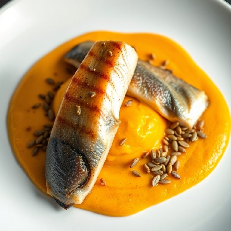 Cação ao Grelho com Purê de Abóbora Cremoso e Crocante de Sementes