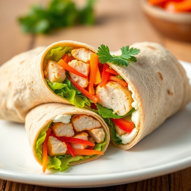 Wrap saudável com peito de frango grelhado temperado e legumes frescos, acompanhado de um molho leve de iogurte natural. Ideal para um lanche rápido, nutritivo e saboroso, perfeito para quem busca praticidade sem abrir mão da saúde.