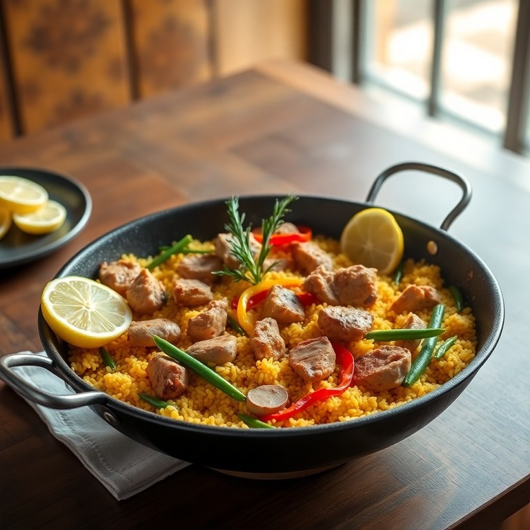Un clásico plato español que combina arroz, pollo, conejo y verduras frescas, cocinado en casa en una auténtica paella para disfrutar de una experiencia tradicional y festiva.