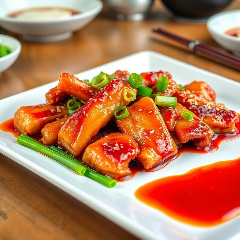 Een authentiek Chinees gerecht met krokant gebakken varkensvlees, gemarineerd in vijfkruidenpoeder en geserveerd met een zoete, kleverige saus. Perfect voor liefhebbers van traditionele Chinese smaken.
