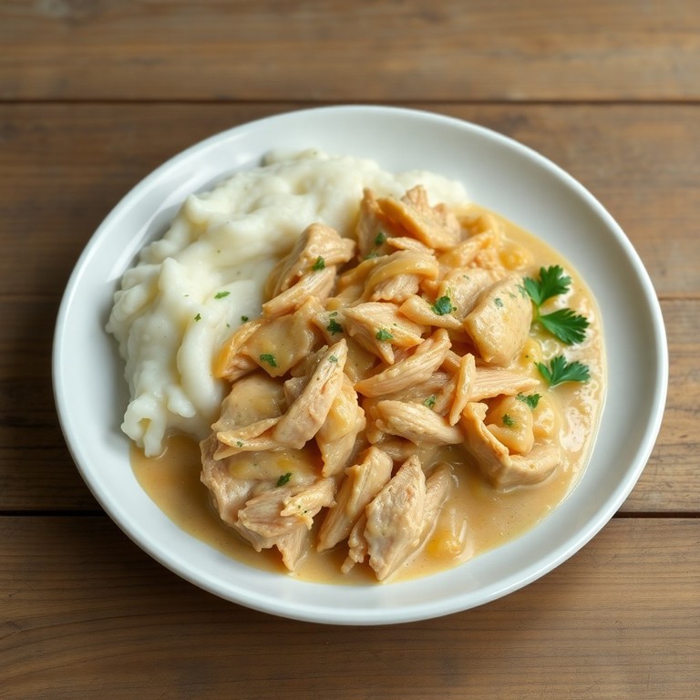 Especialmente preparado com filé de frango desfiado e um molho cremoso feito com temperos suaves, servido junto a um purê de batata macio e saboroso, perfeito para uma refeição reconfortante.