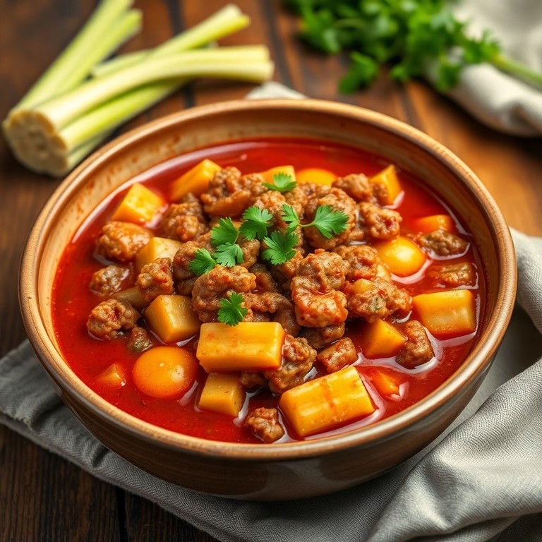 Würziger Sellerie-Hackfleisch-Gulasch ist ein herzhafter Eintopf, der durch langsames Schmoren von Hackfleisch und Staudensellerie seinen intensiven Geschmack entfaltet. Ideal für kühle Tage, verbindet dieses Gericht zarte Fleischstücke mit dem aromatischen Crunch des Selleries und einer ausgewogenen Gewürzmischung.