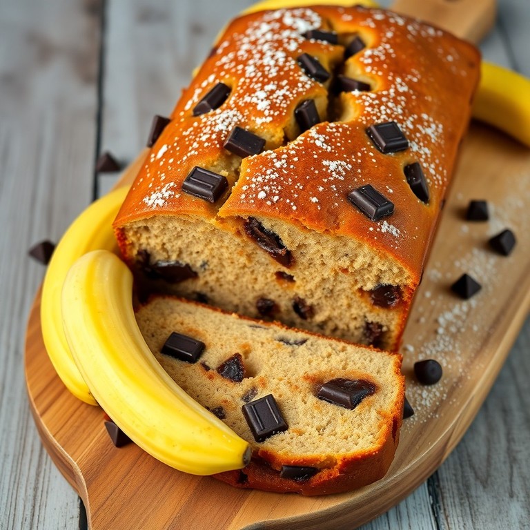 Ein klassisches amerikanisches Bananenbrot mit saftiger Textur und geschmolzenen Schokoladenstückchen. Schnell zubereitet bietet es ein samtiges, schokoladiges Geschmackserlebnis, das perfekt zum Nachmittagskaffee passt.