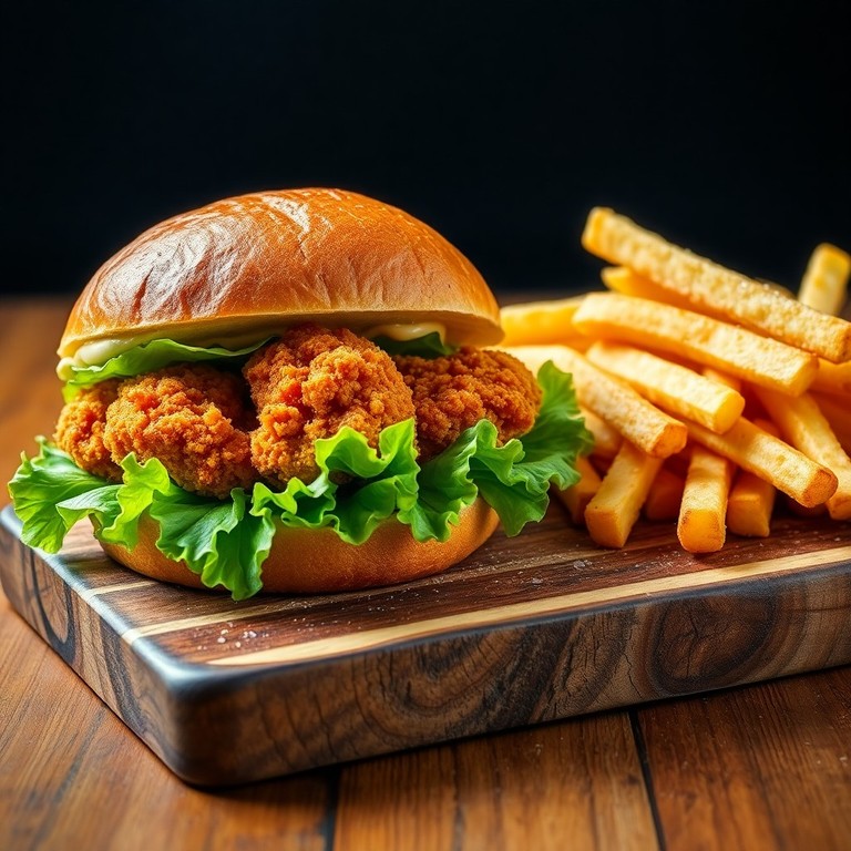 Sanduíche Crocante de Frango Empanado com filés de frango temperados, empanados com farinha e cebola, fritos até dourar e servidos em pão crocante. Acompanha batatas fritas caseiras, perfeito para um almoço saboroso e fácil de preparar.
