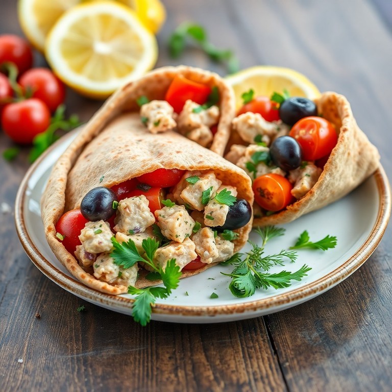 Fresh tuna combined with olives, tomatoes, red onions, and fragrant herbs, all stuffed into warm whole wheat pita pockets. This Mediterranean-inspired sandwich offers vibrant flavors and a healthy twist, perfect for a light lunch or dinner.