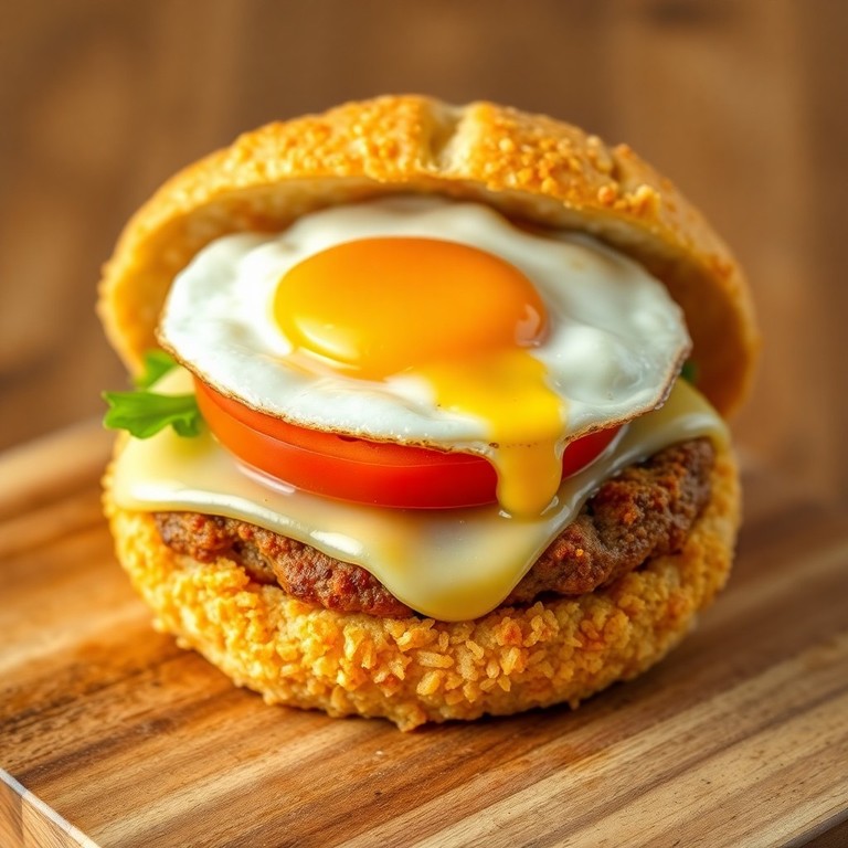 Um lanche saboroso com crosta crocante de flocão de milho, hambúrguer suculento, queijo muçarela derretido e ovo frito com gema mole, perfeito para uma refeição rápida e deliciosa.
