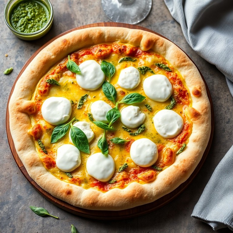 Une pizza blanche croustillante garnie de burrata crémeuse et de pesto parfumé, parfaite pour une soirée gourmande et rapide à préparer.
