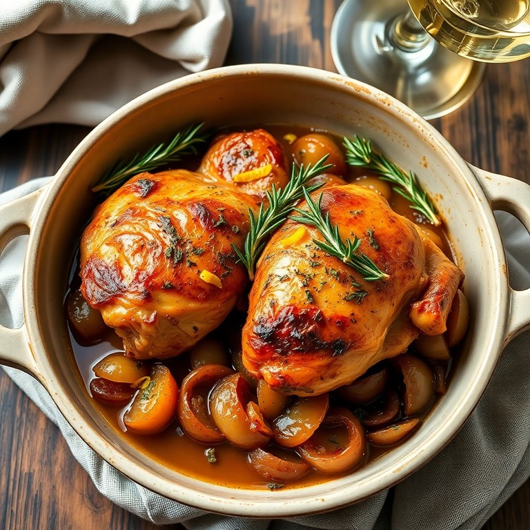 Muslos de pollo marinados en una mezcla aromática de hierbas provenzales, ajo y limón, luego asados al horno sobre cebolla morada hasta lograr una piel crujiente y carne jugosa. Una receta sencilla y reconfortante, ideal para una comida familiar o una cena especial en menos de una hora. El toque de vino blanco y la decoración de romero fresco realzan los sabores mediterráneos.