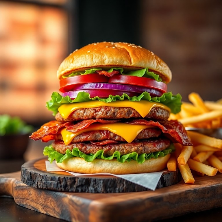 Una hamburguesa gigante con cuatro tipos de carne — res, cerdo, pollo y tocino — combinados en capas con quesos fundidos, vegetales frescos y una salsa deluxe casera. Ideal para los amantes de sabores intensos y una experiencia máxima en cada bocado.