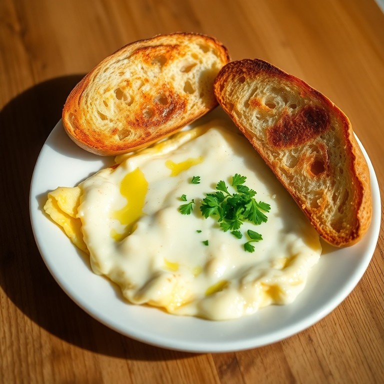 Uma omelete cremosa e saborosa feita com ovos, creme de leite e queijo provolone, acompanhada de pão torrado crocante. Uma opção rápida e deliciosa para um jantar simples e reconfortante.