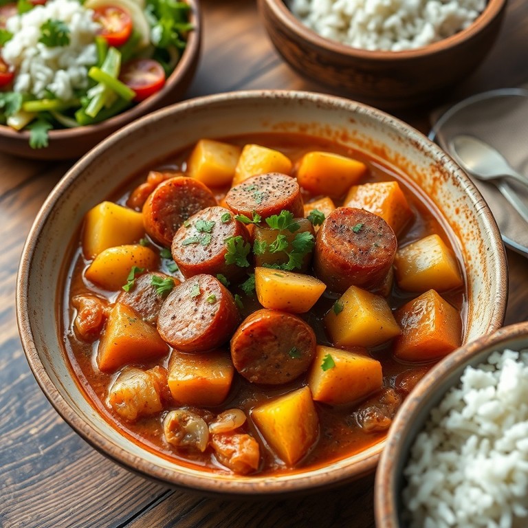 Um prato reconfortante com linguiça defumada, batatas e temperos tradicionais, perfeito para um almoço robusto.