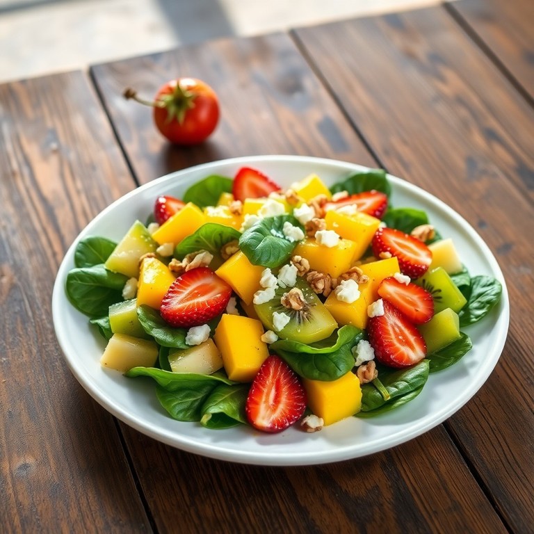 Una ensalada fresca y colorida que combina frutas tropicales y espinaca, ideal para un almuerzo ligero y saludable en menos de 15 minutos. La vinagreta de miel y lima aporta un toque cítrico y dulce que realza los sabores naturales de la fruta y la verdura.