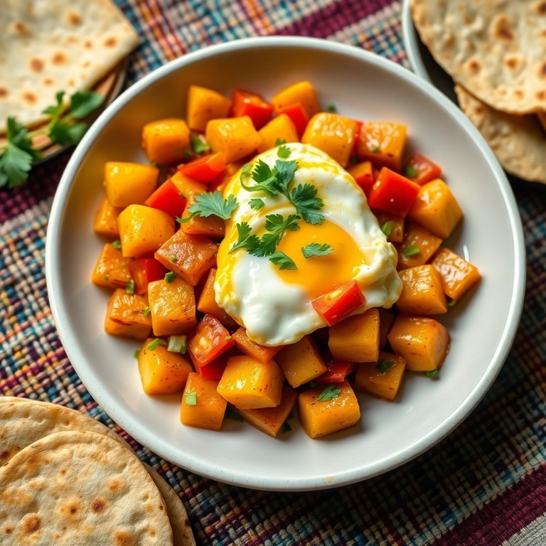 Un plato rápido y sabroso con papas en cubos doradas, tomates frescos y chiles verdes salteados, combinado con huevos revueltos suaves. Ideal para un desayuno energético o una comida ligera, este salteado mexicano ofrece sabores frescos y textura reconfortante.