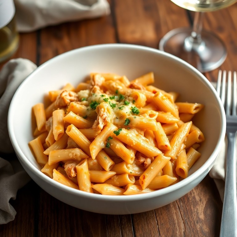 Um prato rápido e saboroso de macarrão com frango desfiado, queijo ralado e um toque cremoso, ideal para um jantar fácil em menos de 30 minutos.
