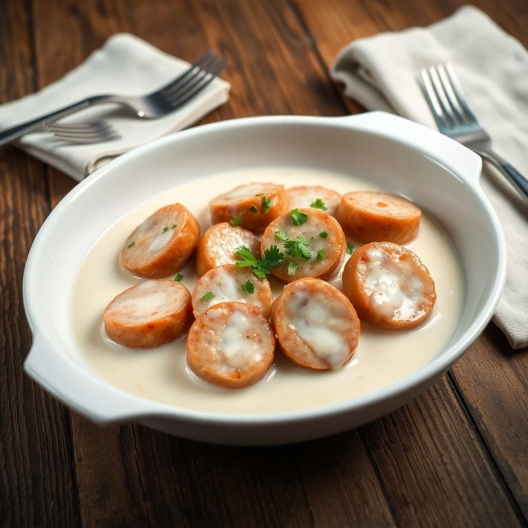 Prato rápido, cremoso e delicioso, ideal para uma refeição leve ou um acompanhamento. As salsichas são douradas e envolvidas em um molho branco feito com manteiga, farinha de trigo e leite, resultando em uma textura suave e sabor delicado com um toque especial de noz-moscada.