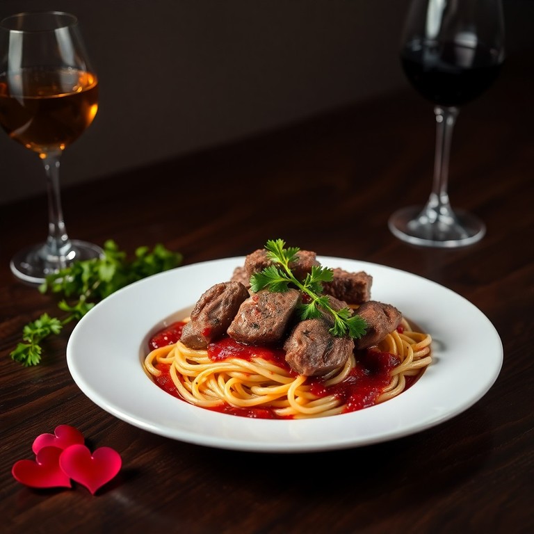 Um prato sofisticado que combina espaguete al dente com tiras suculentas de filé mignon envoltas em um molho aromático de vinho tinto e ervas frescas, perfeito para celebrar o amor no Dia dos Namorados.