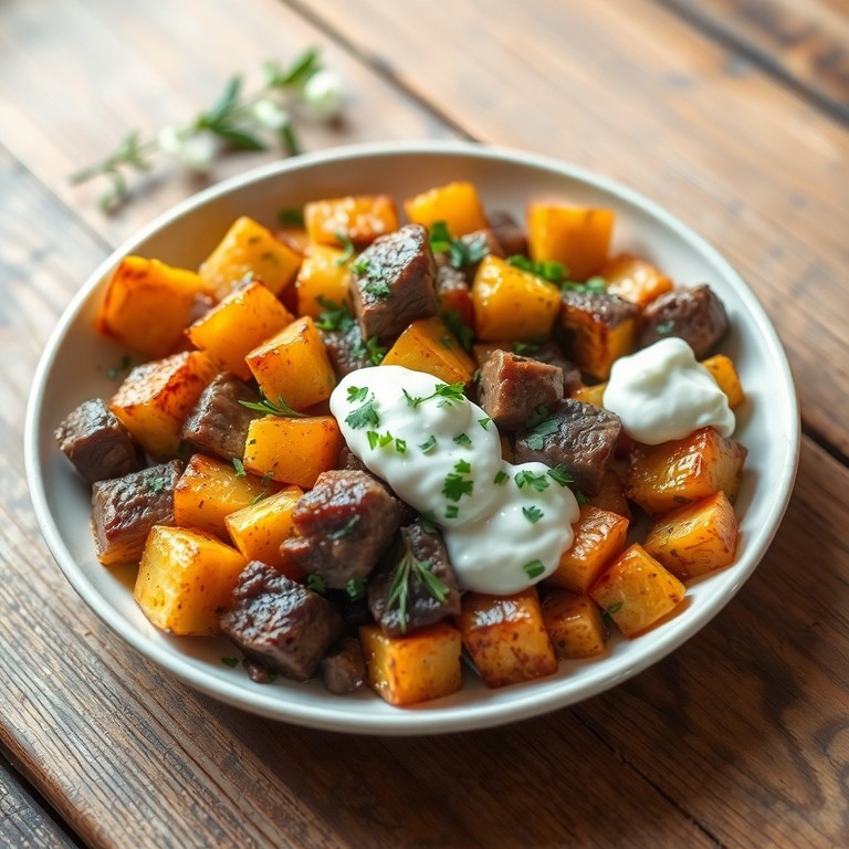 Boniato asado al horno acompañado de tiernos taquitos de carne de res y aromáticas hierbas frescas. Este plato saludable y reconfortante combina la dulzura natural del boniato con el sabor intenso de la carne y el toque fragante de romero y tomillo, ideal para quienes buscan una opción baja en grasas y llena de sabor.