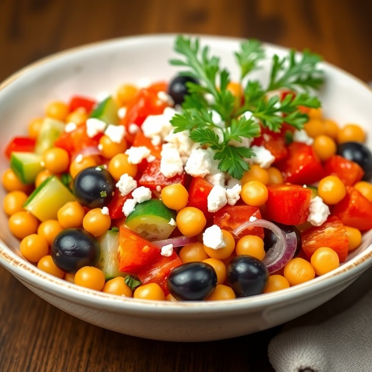 Salada refrescante com grão-de-bico, tomate, pepino, azeitonas e queijo feta, perfeita para refeições leves e nutritivas. Esta receita combina ingredientes frescos e um molho simples que realça os sabores mediterrâneos, ideal para dias quentes ou como acompanhamento saudável.