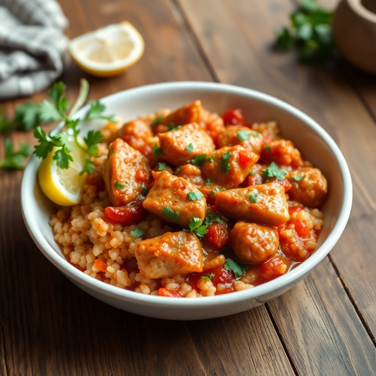 Une version chaude et réconfortante du taboulé, combinant semoule, poulet tendre et sauce tomate épicée pour un plat rapide et léger. Parfait pour un repas savoureux et facile à préparer.