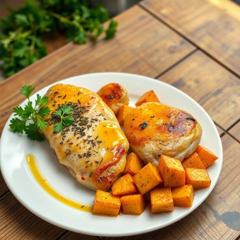 Un plato reconfortante y saludable que combina pechugas de pollo al horno marinadas con hierbas aromáticas y batatas asadas. Fácil de preparar, ideal para menús de dieta equilibrados y nutritivos.