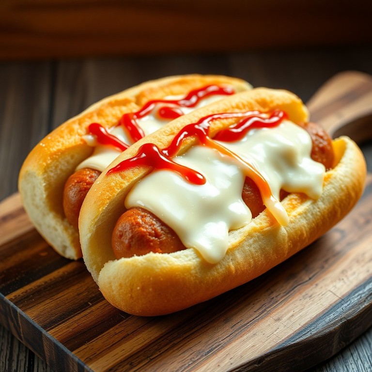 Cachorro-Quente Gourmet com Queijo Mussarela: salsichas empanadas e fritas, envoltas em pão macio, cobertas com queijo mussarela derretido e um molho especial de ketchup com maionese. Uma opção deliciosa e prática para um lanche rápido e saboroso.