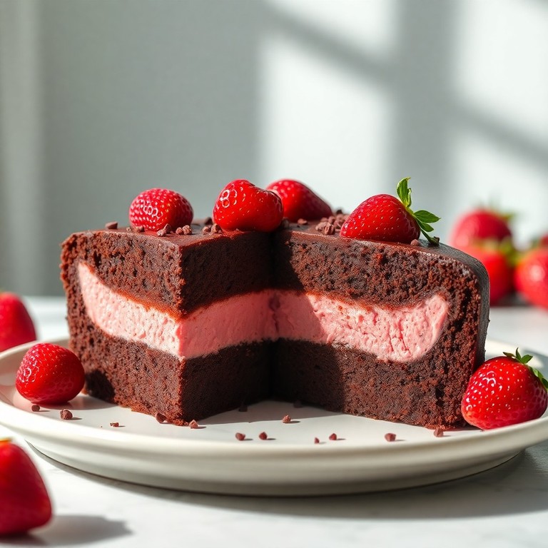 Um bolo de chocolate macio e clássico, recheado com um brigadeiro cremoso feito com pó para suco sabor morango, perfeito para comemorar momentos especiais com simplicidade e muito sabor.