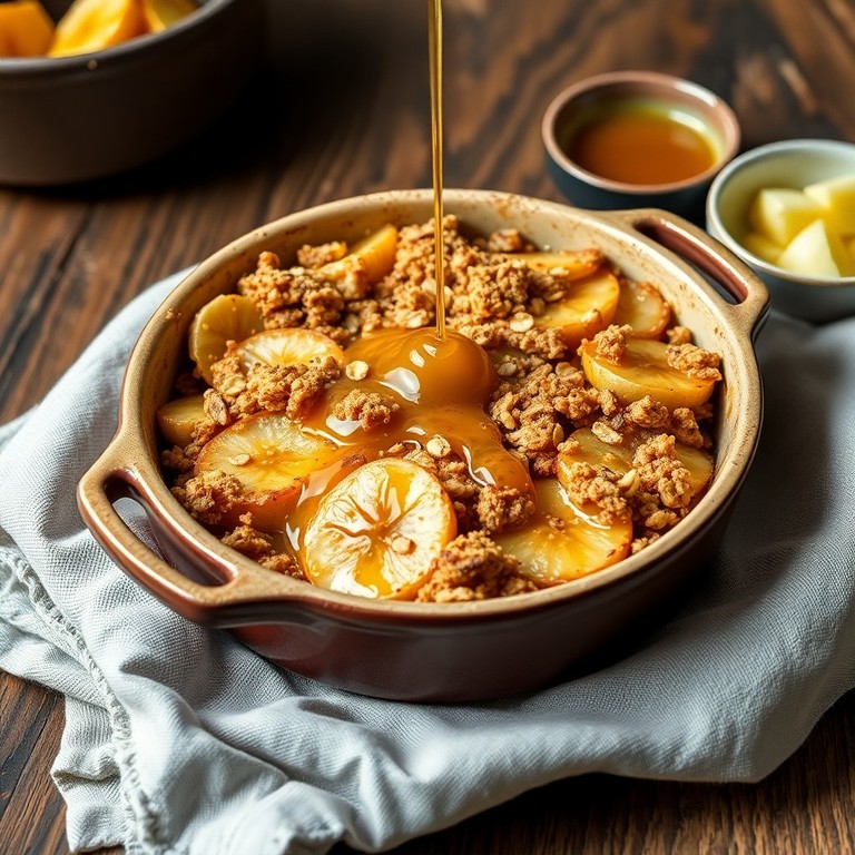 A warm, comforting dessert featuring ripe bananas and pears tossed with fresh orange juice and zest, topped with a buttery oat crumble, and finished with a sweet honey and vanilla drizzle. Perfect for cozy evenings or a delightful end to any meal.