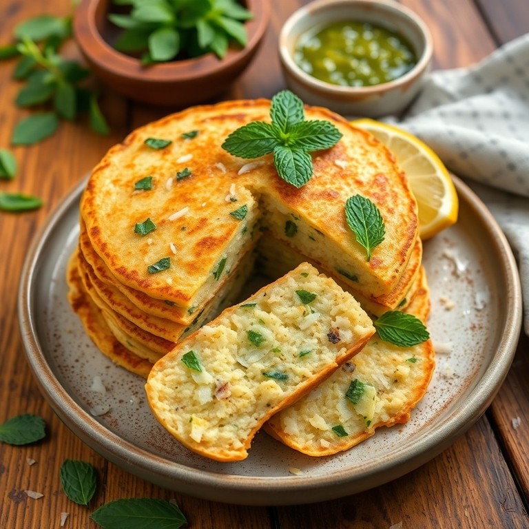These savory Coconut Mint Rice Flour Pancakes combine the nutty flavor of rice flour with fresh mint and shredded coconut for a light, aromatic snack or breakfast. Enhanced with finely chopped onion, green chili, and curry leaves, they offer a subtle spice and herbaceous freshness. Served with a squeeze of lemon, these pancakes are quick to prepare and perfect for a wholesome start or a flavorful snack.