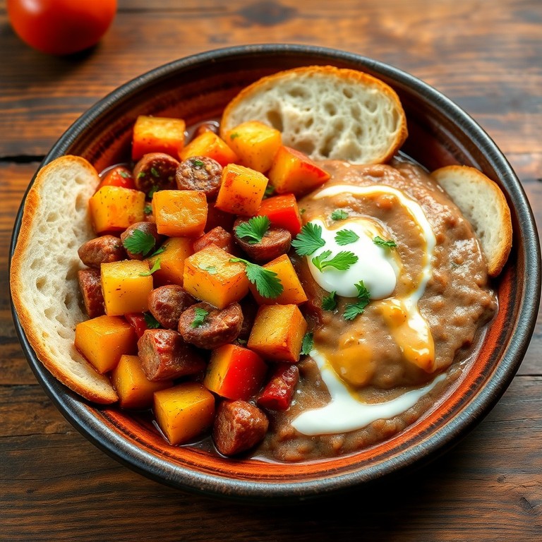 Una cena reconfortante y fácil de preparar que combina salchichas salteadas con papas doradas y una porción cremosa de frijoles refritos, acompañada de pan blanco fresco. Este platillo tradicional mexicano es ideal para dos personas y ofrece sabores caseros y satisfactorios, perfectos para una comida rápida y deliciosa.