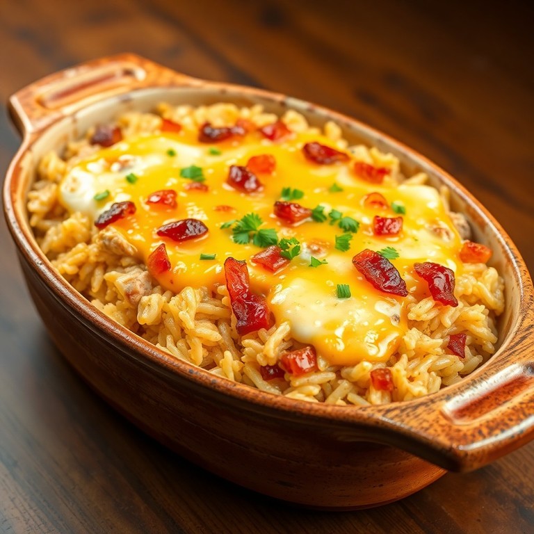 Um prato assado fácil e saboroso que mistura arroz, frango, queijo, bacon e cebola, ideal para refeições em família ou para surpreender na janta. A combinação do frango desfiado com o bacon crocante e o queijo derretido cria uma textura cremosa e irresistível, enquanto a cebola refogada adiciona um toque adocicado e aromático.