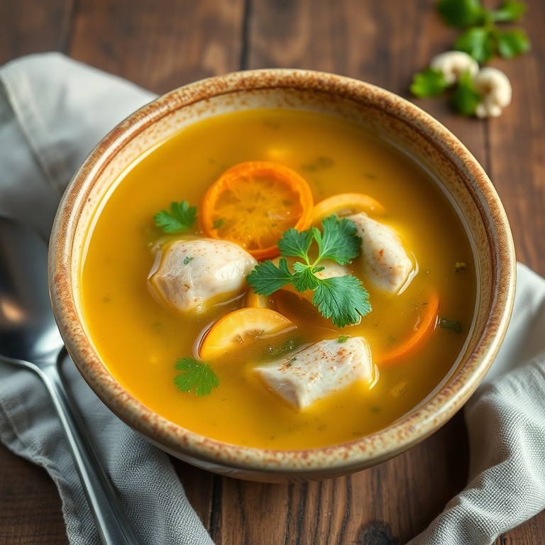 A comforting and clear chicken soup infused with fresh ginger, turmeric, and traditional Indonesian herbs and spices. This nourishing soup combines aromatic shallots, garlic, kencur, and galangal with coriander and pepper to create a flavorful broth that boosts immunity and warms the body. Perfect for chilly days or when you need a wholesome, revitalizing meal.