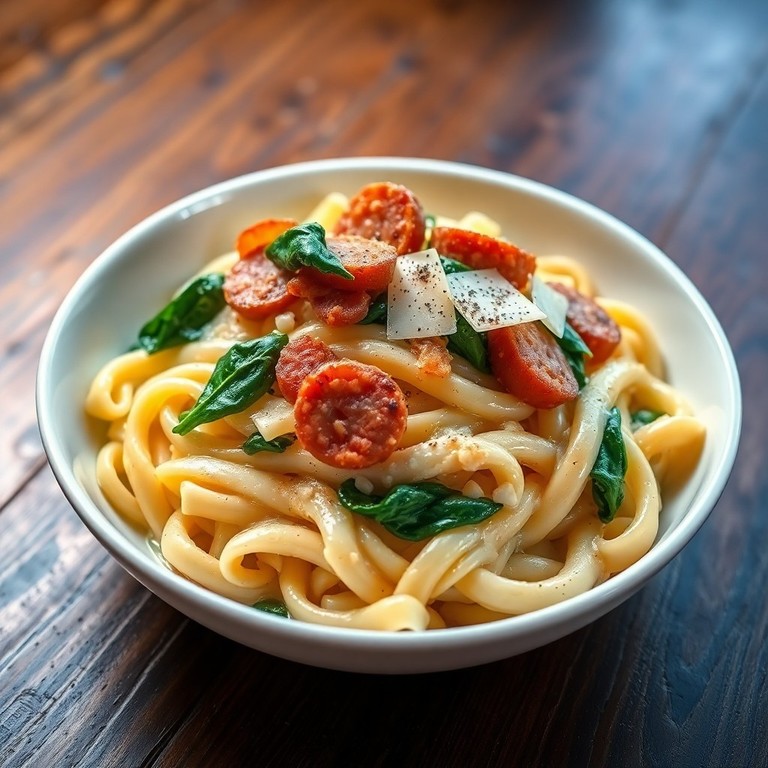 Macarrão Cremoso de Queijo com Calabresa e Espinafre