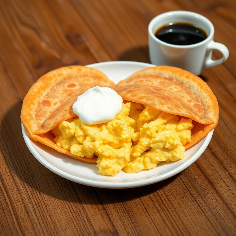 Deliciosas arepas crujientes rellenas con huevos revueltos suaves y cremosos, acompañadas de un toque fresco y ligeramente ácido de crema agria. Este plato es ideal para un desayuno nutritivo y lleno de sabor, que combina la textura dorada de la arepa con la suavidad del relleno y el contraste de la crema agria. Se recomienda acompañar con una taza de café recién hecho para completar la experiencia matutina.