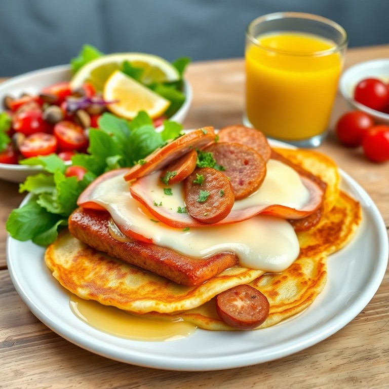 Uma panqueca leve e dourada feita com tapioca, ovos e leite, recheada com presunto, queijo mussarela derretido e linguiça toscana saborosa. Uma opção rápida, nutritiva e ainda mais saborosa, perfeita para qualquer hora do dia.