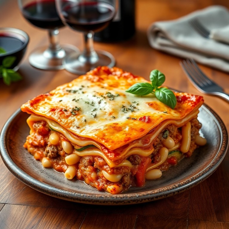 Una lasaña abundante y reconfortante que combina carne molida, porotos blancos, y verduras frescas en capas delicadas de pasta, bañada en una salsa de tomate casera aromática. Ideal para compartir en familia, este plato ofrece un equilibrio perfecto entre sabores y texturas, con un toque casero que invita a disfrutar cada bocado.
