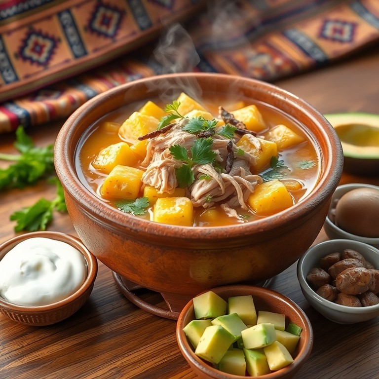 El Ajiaco es una sopa tradicional colombiana, especialmente popular en la región de Bogotá. Esta receta está diseñada para preparar una gran cantidad, ideal para reuniones familiares o eventos. Combina tres tipos de papas, pollo, mazorcas de maíz y la hierba guasca, que le da su sabor característico. Se sirve acompañado de crema de leche, alcaparras y aguacate para realzar su sabor.